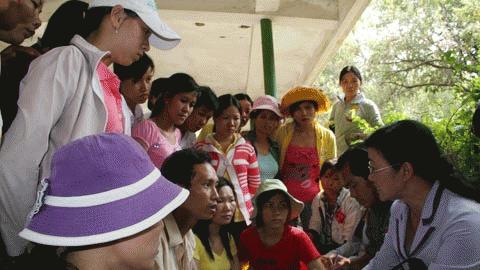 Cán bộ công đoàn huyện Hóc Môn đang thuyết phục công nhân Hải Vinh bình tĩnh chờ xử lý của cơ quan chức năng..